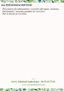 A la fin de cette relaxation statique, je poursuis par une étape intitulée désophronisation pour revenir dans un état de conscience ordinaire.